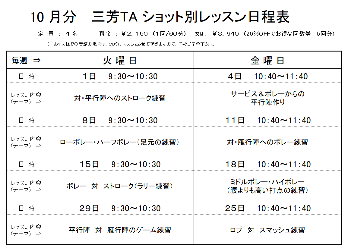ショット別レッスン日程表(10月分)画像