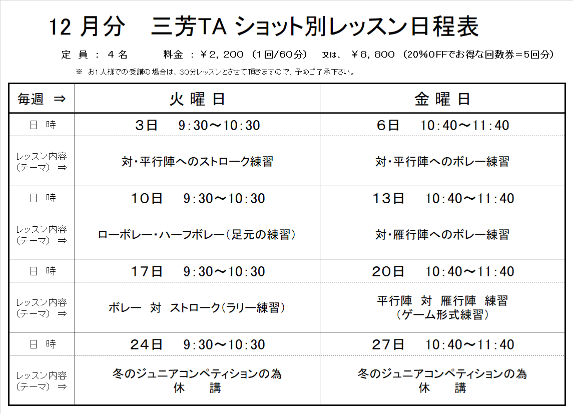 ショット別レッスン日程表(12月分)画像